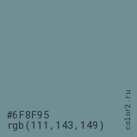 Цвет #6F8F95 в цветовой модели RGB обозначается тремя октетами (111, 143, 149) в десятичном формате и #6F8F95 в шестнадцатиричном (hex) формате, которые являются интенсивностью красного 111 (hex 6F), интенсивность зелёного 143 (hex 8F) и интенсивность синего 149 (hex 95).