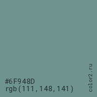 Цвет #6F948D в цветовой модели RGB обозначается тремя октетами (111, 148, 141) в десятичном формате и #6F948D в шестнадцатиричном (hex) формате, которые являются интенсивностью красного 111 (hex 6F), интенсивность зелёного 148 (hex 94) и интенсивность синего 141 (hex 8D).