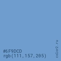 Цвет #6F9DCD в цветовой модели RGB обозначается тремя октетами (111, 157, 205) в десятичном формате и #6F9DCD в шестнадцатиричном (hex) формате, которые являются интенсивностью красного 111 (hex 6F), интенсивность зелёного 157 (hex 9D) и интенсивность синего 205 (hex CD).