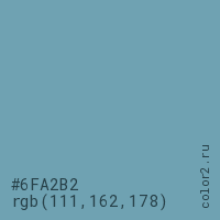 Цвет #6FA2B2 в цветовой модели RGB обозначается тремя октетами (111, 162, 178) в десятичном формате и #6FA2B2 в шестнадцатиричном (hex) формате, которые являются интенсивностью красного 111 (hex 6F), интенсивность зелёного 162 (hex A2) и интенсивность синего 178 (hex B2).
