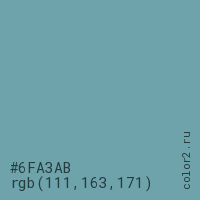 Цвет #6FA3AB в цветовой модели RGB обозначается тремя октетами (111, 163, 171) в десятичном формате и #6FA3AB в шестнадцатиричном (hex) формате, которые являются интенсивностью красного 111 (hex 6F), интенсивность зелёного 163 (hex A3) и интенсивность синего 171 (hex AB).