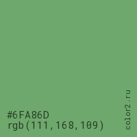 Цвет #6FA86D в цветовой модели RGB обозначается тремя октетами (111, 168, 109) в десятичном формате и #6FA86D в шестнадцатиричном (hex) формате, которые являются интенсивностью красного 111 (hex 6F), интенсивность зелёного 168 (hex A8) и интенсивность синего 109 (hex 6D).