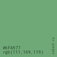 Цвет #6FA977 в цветовой модели RGB обозначается тремя октетами (111, 169, 119) в десятичном формате и #6FA977 в шестнадцатиричном (hex) формате, которые являются интенсивностью красного 111 (hex 6F), интенсивность зелёного 169 (hex A9) и интенсивность синего 119 (hex 77).