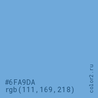 Цвет #6FA9DA в цветовой модели RGB обозначается тремя октетами (111, 169, 218) в десятичном формате и #6FA9DA в шестнадцатиричном (hex) формате, которые являются интенсивностью красного 111 (hex 6F), интенсивность зелёного 169 (hex A9) и интенсивность синего 218 (hex DA).