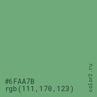 Цвет #6FAA7B в цветовой модели RGB обозначается тремя октетами (111, 170, 123) в десятичном формате и #6FAA7B в шестнадцатиричном (hex) формате, которые являются интенсивностью красного 111 (hex 6F), интенсивность зелёного 170 (hex AA) и интенсивность синего 123 (hex 7B).