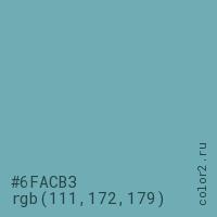 Цвет #6FACB3 в цветовой модели RGB обозначается тремя октетами (111, 172, 179) в десятичном формате и #6FACB3 в шестнадцатиричном (hex) формате, которые являются интенсивностью красного 111 (hex 6F), интенсивность зелёного 172 (hex AC) и интенсивность синего 179 (hex B3).