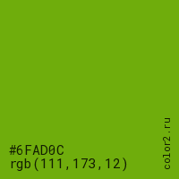 Цвет #6FAD0C в цветовой модели RGB обозначается тремя октетами (111, 173, 12) в десятичном формате и #6FAD0C в шестнадцатиричном (hex) формате, которые являются интенсивностью красного 111 (hex 6F), интенсивность зелёного 173 (hex AD) и интенсивность синего 12 (hex 0C).