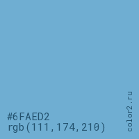 Цвет #6FAED2 в цветовой модели RGB обозначается тремя октетами (111, 174, 210) в десятичном формате и #6FAED2 в шестнадцатиричном (hex) формате, которые являются интенсивностью красного 111 (hex 6F), интенсивность зелёного 174 (hex AE) и интенсивность синего 210 (hex D2).