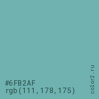 Цвет #6FB2AF в цветовой модели RGB обозначается тремя октетами (111, 178, 175) в десятичном формате и #6FB2AF в шестнадцатиричном (hex) формате, которые являются интенсивностью красного 111 (hex 6F), интенсивность зелёного 178 (hex B2) и интенсивность синего 175 (hex AF).
