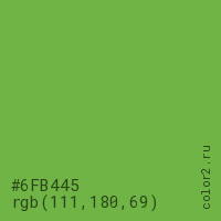 Цвет #6FB445 в цветовой модели RGB обозначается тремя октетами (111, 180, 69) в десятичном формате и #6FB445 в шестнадцатиричном (hex) формате, которые являются интенсивностью красного 111 (hex 6F), интенсивность зелёного 180 (hex B4) и интенсивность синего 69 (hex 45).