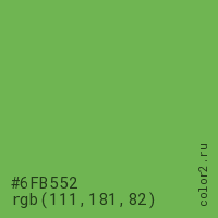 Цвет #6FB552 в цветовой модели RGB обозначается тремя октетами (111, 181, 82) в десятичном формате и #6FB552 в шестнадцатиричном (hex) формате, которые являются интенсивностью красного 111 (hex 6F), интенсивность зелёного 181 (hex B5) и интенсивность синего 82 (hex 52).