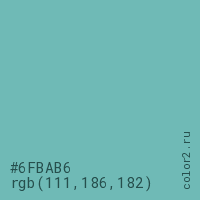 Цвет #6FBAB6 в цветовой модели RGB обозначается тремя октетами (111, 186, 182) в десятичном формате и #6FBAB6 в шестнадцатиричном (hex) формате, которые являются интенсивностью красного 111 (hex 6F), интенсивность зелёного 186 (hex BA) и интенсивность синего 182 (hex B6).