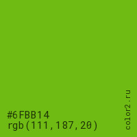 Цвет #6FBB14 в цветовой модели RGB обозначается тремя октетами (111, 187, 20) в десятичном формате и #6FBB14 в шестнадцатиричном (hex) формате, которые являются интенсивностью красного 111 (hex 6F), интенсивность зелёного 187 (hex BB) и интенсивность синего 20 (hex 14).