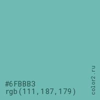 Цвет #6FBBB3 в цветовой модели RGB обозначается тремя октетами (111, 187, 179) в десятичном формате и #6FBBB3 в шестнадцатиричном (hex) формате, которые являются интенсивностью красного 111 (hex 6F), интенсивность зелёного 187 (hex BB) и интенсивность синего 179 (hex B3).