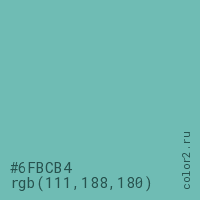 Цвет #6FBCB4 в цветовой модели RGB обозначается тремя октетами (111, 188, 180) в десятичном формате и #6FBCB4 в шестнадцатиричном (hex) формате, которые являются интенсивностью красного 111 (hex 6F), интенсивность зелёного 188 (hex BC) и интенсивность синего 180 (hex B4).