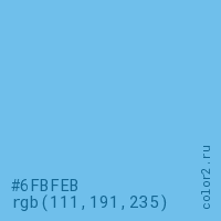 Цвет #6FBFEB в цветовой модели RGB обозначается тремя октетами (111, 191, 235) в десятичном формате и #6FBFEB в шестнадцатиричном (hex) формате, которые являются интенсивностью красного 111 (hex 6F), интенсивность зелёного 191 (hex BF) и интенсивность синего 235 (hex EB).