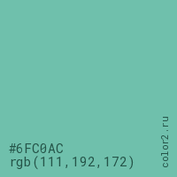 Цвет #6FC0AC в цветовой модели RGB обозначается тремя октетами (111, 192, 172) в десятичном формате и #6FC0AC в шестнадцатиричном (hex) формате, которые являются интенсивностью красного 111 (hex 6F), интенсивность зелёного 192 (hex C0) и интенсивность синего 172 (hex AC).