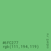 Цвет #6FC277 в цветовой модели RGB обозначается тремя октетами (111, 194, 119) в десятичном формате и #6FC277 в шестнадцатиричном (hex) формате, которые являются интенсивностью красного 111 (hex 6F), интенсивность зелёного 194 (hex C2) и интенсивность синего 119 (hex 77).