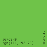 Цвет #6FC349 в цветовой модели RGB обозначается тремя октетами (111, 195, 73) в десятичном формате и #6FC349 в шестнадцатиричном (hex) формате, которые являются интенсивностью красного 111 (hex 6F), интенсивность зелёного 195 (hex C3) и интенсивность синего 73 (hex 49).
