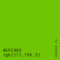 Цвет #6FC403 в цветовой модели RGB обозначается тремя октетами (111, 196, 3) в десятичном формате и #6FC403 в шестнадцатиричном (hex) формате, которые являются интенсивностью красного 111 (hex 6F), интенсивность зелёного 196 (hex C4) и интенсивность синего 3 (hex 03).