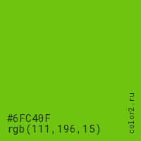Цвет #6FC40F в цветовой модели RGB обозначается тремя октетами (111, 196, 15) в десятичном формате и #6FC40F в шестнадцатиричном (hex) формате, которые являются интенсивностью красного 111 (hex 6F), интенсивность зелёного 196 (hex C4) и интенсивность синего 15 (hex 0F).