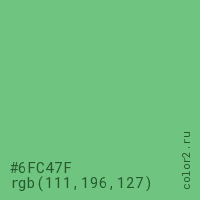 Цвет #6FC47F в цветовой модели RGB обозначается тремя октетами (111, 196, 127) в десятичном формате и #6FC47F в шестнадцатиричном (hex) формате, которые являются интенсивностью красного 111 (hex 6F), интенсивность зелёного 196 (hex C4) и интенсивность синего 127 (hex 7F).