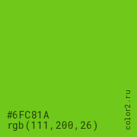 Цвет #6FC81A в цветовой модели RGB обозначается тремя октетами (111, 200, 26) в десятичном формате и #6FC81A в шестнадцатиричном (hex) формате, которые являются интенсивностью красного 111 (hex 6F), интенсивность зелёного 200 (hex C8) и интенсивность синего 26 (hex 1A).