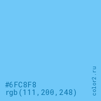Цвет #6FC8F8 в цветовой модели RGB обозначается тремя октетами (111, 200, 248) в десятичном формате и #6FC8F8 в шестнадцатиричном (hex) формате, которые являются интенсивностью красного 111 (hex 6F), интенсивность зелёного 200 (hex C8) и интенсивность синего 248 (hex F8).