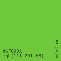 Цвет #6FC93A в цветовой модели RGB обозначается тремя октетами (111, 201, 58) в десятичном формате и #6FC93A в шестнадцатиричном (hex) формате, которые являются интенсивностью красного 111 (hex 6F), интенсивность зелёного 201 (hex C9) и интенсивность синего 58 (hex 3A).
