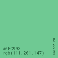 Цвет #6FC993 в цветовой модели RGB обозначается тремя октетами (111, 201, 147) в десятичном формате и #6FC993 в шестнадцатиричном (hex) формате, которые являются интенсивностью красного 111 (hex 6F), интенсивность зелёного 201 (hex C9) и интенсивность синего 147 (hex 93).