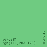 Цвет #6FCB81 в цветовой модели RGB обозначается тремя октетами (111, 203, 129) в десятичном формате и #6FCB81 в шестнадцатиричном (hex) формате, которые являются интенсивностью красного 111 (hex 6F), интенсивность зелёного 203 (hex CB) и интенсивность синего 129 (hex 81).