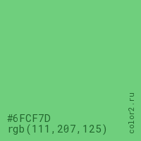 Цвет RGB(111, 207, 125) в процентом отношении количества цвета состоит из 43.5% красного (red), 81.2% зелёного (green) и 49% синего (blue).