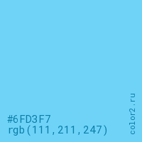 Цвет #6FD3F7 в цветовой модели RGB обозначается тремя октетами (111, 211, 247) в десятичном формате и #6FD3F7 в шестнадцатиричном (hex) формате, которые являются интенсивностью красного 111 (hex 6F), интенсивность зелёного 211 (hex D3) и интенсивность синего 247 (hex F7).