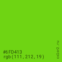 Цвет #6FD413 в цветовой модели RGB обозначается тремя октетами (111, 212, 19) в десятичном формате и #6FD413 в шестнадцатиричном (hex) формате, которые являются интенсивностью красного 111 (hex 6F), интенсивность зелёного 212 (hex D4) и интенсивность синего 19 (hex 13).