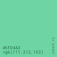 Цвет #6FD4A3 в цветовой модели RGB обозначается тремя октетами (111, 212, 163) в десятичном формате и #6FD4A3 в шестнадцатиричном (hex) формате, которые являются интенсивностью красного 111 (hex 6F), интенсивность зелёного 212 (hex D4) и интенсивность синего 163 (hex A3).