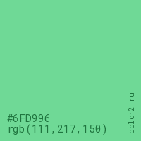 Цвет #6FD996 в цветовой модели RGB обозначается тремя октетами (111, 217, 150) в десятичном формате и #6FD996 в шестнадцатиричном (hex) формате, которые являются интенсивностью красного 111 (hex 6F), интенсивность зелёного 217 (hex D9) и интенсивность синего 150 (hex 96).