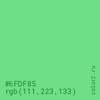 Цвет #6FDF85 в цветовой модели RGB обозначается тремя октетами (111, 223, 133) в десятичном формате и #6FDF85 в шестнадцатиричном (hex) формате, которые являются интенсивностью красного 111 (hex 6F), интенсивность зелёного 223 (hex DF) и интенсивность синего 133 (hex 85).