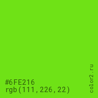 Цвет #6FE216 в цветовой модели RGB обозначается тремя октетами (111, 226, 22) в десятичном формате и #6FE216 в шестнадцатиричном (hex) формате, которые являются интенсивностью красного 111 (hex 6F), интенсивность зелёного 226 (hex E2) и интенсивность синего 22 (hex 16).