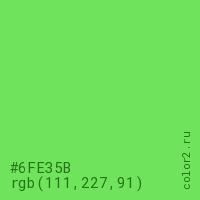 Цвет #6FE35B в цветовой модели RGB обозначается тремя октетами (111, 227, 91) в десятичном формате и #6FE35B в шестнадцатиричном (hex) формате, которые являются интенсивностью красного 111 (hex 6F), интенсивность зелёного 227 (hex E3) и интенсивность синего 91 (hex 5B).