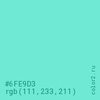 Цвет #6FE9D3 в цветовой модели RGB обозначается тремя октетами (111, 233, 211) в десятичном формате и #6FE9D3 в шестнадцатиричном (hex) формате, которые являются интенсивностью красного 111 (hex 6F), интенсивность зелёного 233 (hex E9) и интенсивность синего 211 (hex D3).
