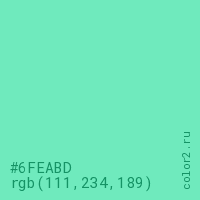 Цвет #6FEABD в цветовой модели RGB обозначается тремя октетами (111, 234, 189) в десятичном формате и #6FEABD в шестнадцатиричном (hex) формате, которые являются интенсивностью красного 111 (hex 6F), интенсивность зелёного 234 (hex EA) и интенсивность синего 189 (hex BD).