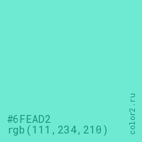 Цвет #6FEAD2 в цветовой модели RGB обозначается тремя октетами (111, 234, 210) в десятичном формате и #6FEAD2 в шестнадцатиричном (hex) формате, которые являются интенсивностью красного 111 (hex 6F), интенсивность зелёного 234 (hex EA) и интенсивность синего 210 (hex D2).