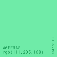 Цвет #6FEBA8 в цветовой модели RGB обозначается тремя октетами (111, 235, 168) в десятичном формате и #6FEBA8 в шестнадцатиричном (hex) формате, которые являются интенсивностью красного 111 (hex 6F), интенсивность зелёного 235 (hex EB) и интенсивность синего 168 (hex A8).