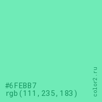 Цвет #6FEBB7 в цветовой модели RGB обозначается тремя октетами (111, 235, 183) в десятичном формате и #6FEBB7 в шестнадцатиричном (hex) формате, которые являются интенсивностью красного 111 (hex 6F), интенсивность зелёного 235 (hex EB) и интенсивность синего 183 (hex B7).