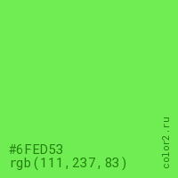 Цвет #6FED53 в цветовой модели RGB обозначается тремя октетами (111, 237, 83) в десятичном формате и #6FED53 в шестнадцатиричном (hex) формате, которые являются интенсивностью красного 111 (hex 6F), интенсивность зелёного 237 (hex ED) и интенсивность синего 83 (hex 53).