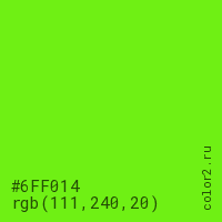 Цвет #6FF014 в цветовой модели RGB обозначается тремя октетами (111, 240, 20) в десятичном формате и #6FF014 в шестнадцатиричном (hex) формате, которые являются интенсивностью красного 111 (hex 6F), интенсивность зелёного 240 (hex F0) и интенсивность синего 20 (hex 14).