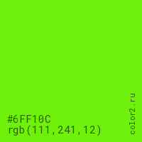 Цвет #6FF10C в цветовой модели RGB обозначается тремя октетами (111, 241, 12) в десятичном формате и #6FF10C в шестнадцатиричном (hex) формате, которые являются интенсивностью красного 111 (hex 6F), интенсивность зелёного 241 (hex F1) и интенсивность синего 12 (hex 0C).