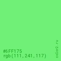 Цвет #6FF175 в цветовой модели RGB обозначается тремя октетами (111, 241, 117) в десятичном формате и #6FF175 в шестнадцатиричном (hex) формате, которые являются интенсивностью красного 111 (hex 6F), интенсивность зелёного 241 (hex F1) и интенсивность синего 117 (hex 75).