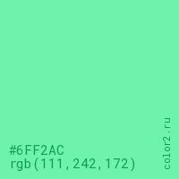 Цвет #6FF2AC в цветовой модели RGB обозначается тремя октетами (111, 242, 172) в десятичном формате и #6FF2AC в шестнадцатиричном (hex) формате, которые являются интенсивностью красного 111 (hex 6F), интенсивность зелёного 242 (hex F2) и интенсивность синего 172 (hex AC).