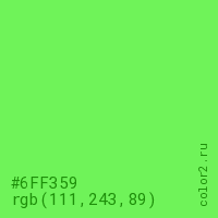 Цвет #6FF359 в цветовой модели RGB обозначается тремя октетами (111, 243, 89) в десятичном формате и #6FF359 в шестнадцатиричном (hex) формате, которые являются интенсивностью красного 111 (hex 6F), интенсивность зелёного 243 (hex F3) и интенсивность синего 89 (hex 59).
